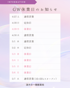 5月1日(水)12:00までに、お電話・LINEでご連絡いただければ当日発送も可能ですので、お薬の不足がないか今一度ご確認をお願いいたします。